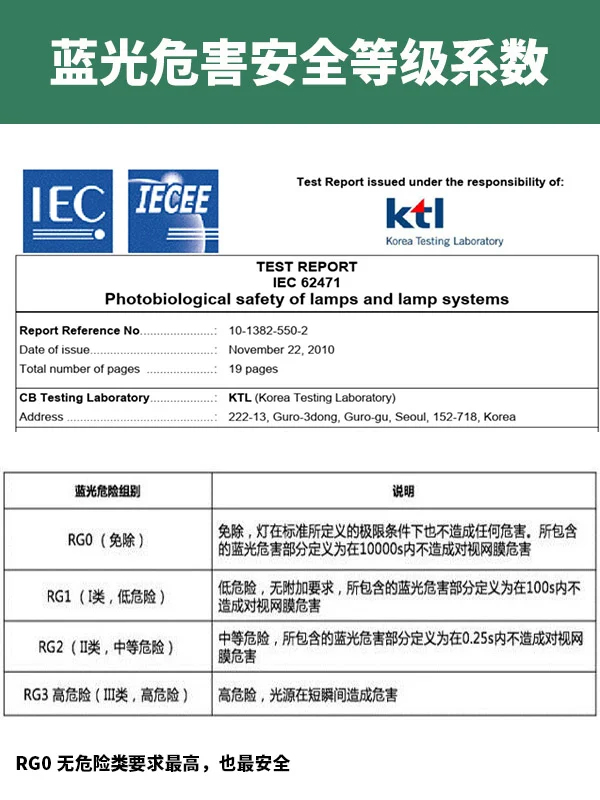 很多人可能以为RG0就代表产品没有蓝光了。其实,RG0并不是大家认为的蓝光为“0”,它是一个安全等级系数。